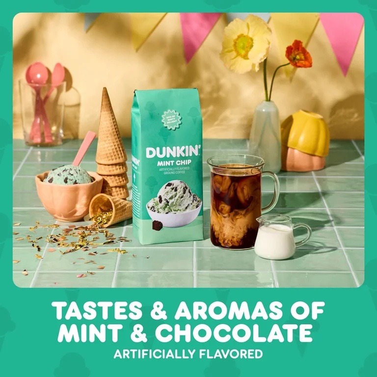 Treat your taste buds to the refreshingly sweet, creamy flavor of mint chocolate chip ice cream - no spoon or cone required. Dunkin’ Mint Chip artificially flavored coffee is a smooth, bold dark roast coffee with the tastes and aromas of mint and chocolate. Drink it as-is or make it your own by adding your favorite creamer and sweetener. Its ground coffee form is easy to brew with virtually any coffee maker, so you can enjoy the great taste of Dunkin’ at home whenever you crave it. Order this limited-edition flavor today and indulge in sips of minty delight … before it melts away.