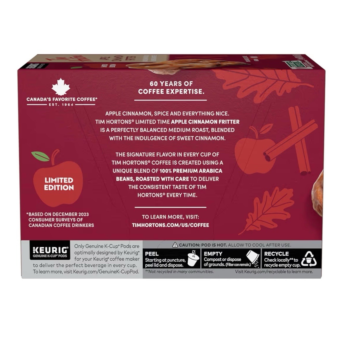 Our Limited Time Tim Hortons Apple Cinnamon Fritter Flavor K-CUPs are the perfect way to start a crisp fall day! Inspired by our best-selling Apple Fritters we sell at our Tim Hortons restaurants, these 100% Arabica pods celebrate the season with classic Apple and Cinnamon flavors.
